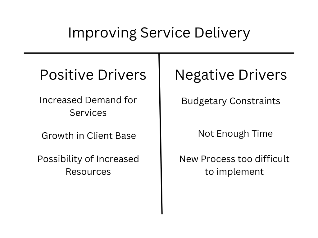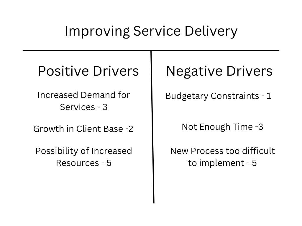 On the left hand side we have our “pros” or our positive drivers. If we improved our service delivery, this might be the reasonable outcomes we can expect to see. On the right hand side, these are the “cons”, or the negative drivers. Often these are the obstacles we see that we need to overcome.